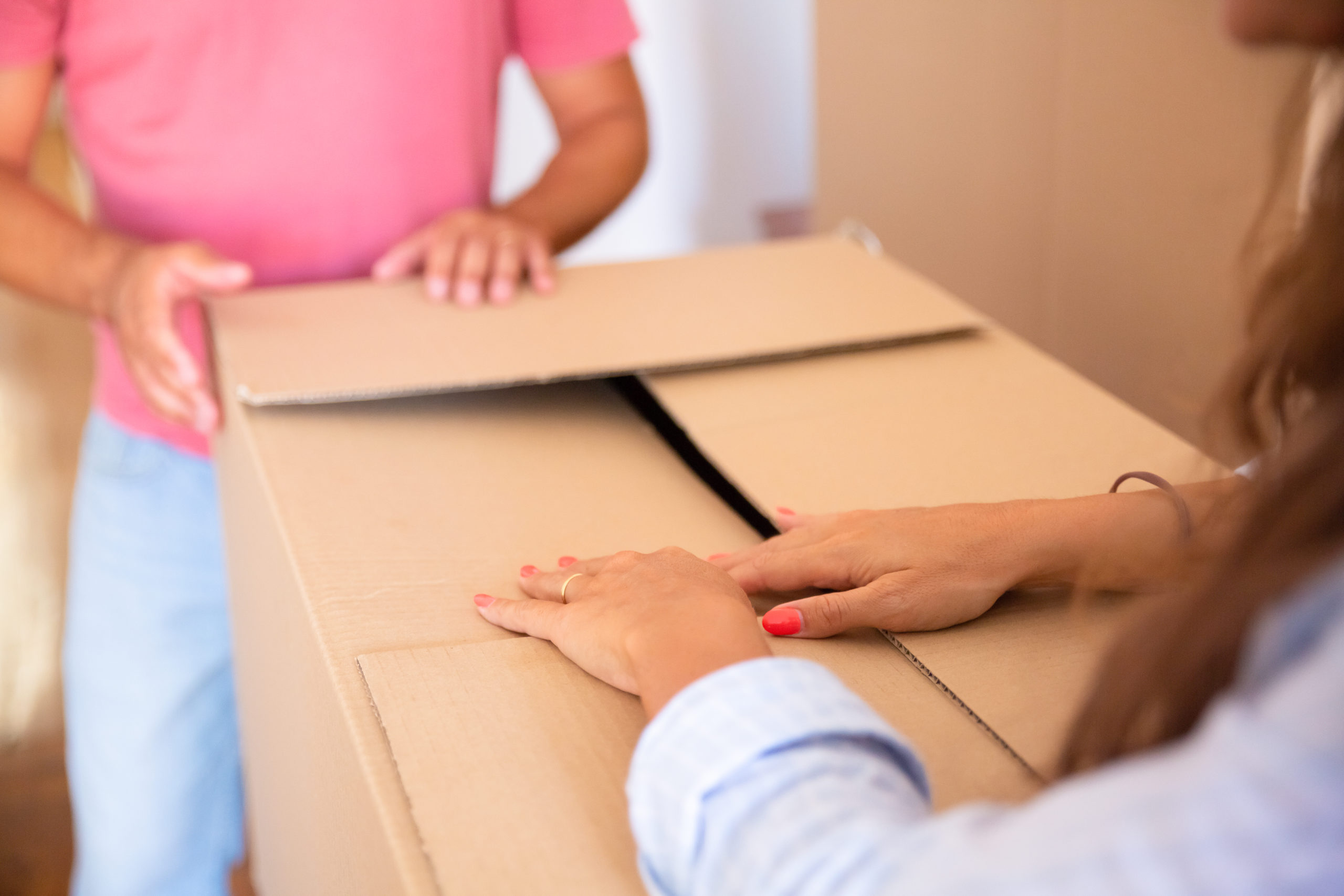 Man and woman moving and unpacking things. Closeup of female and male arms on carton box. Cropped shot. Relocation or new home concept