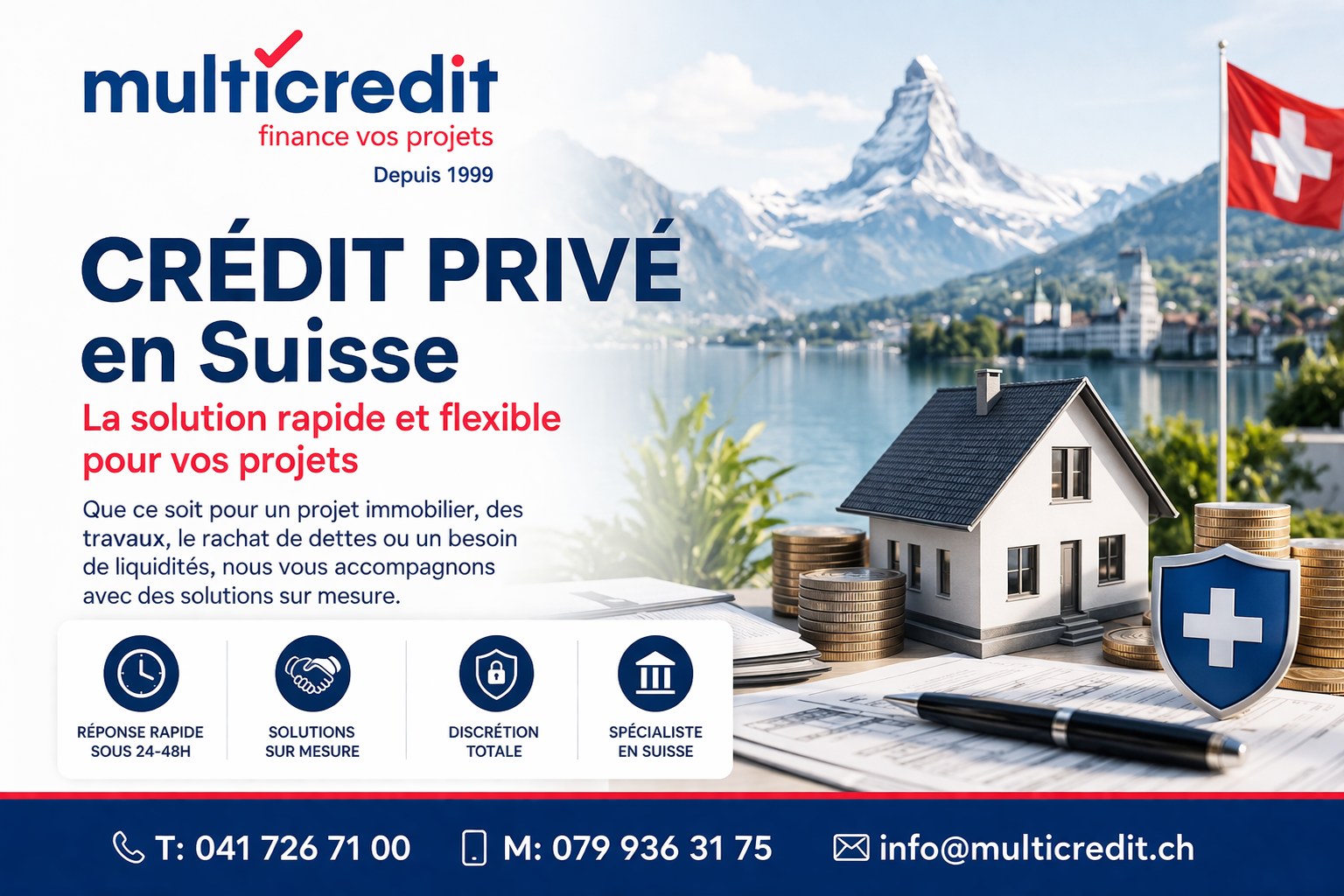 MultiCredit se présente comme un spécialiste du crédit privé et du refinancement en Suisse. Le site met en avant des montants allant de 3’000 à 400’000 CHF, des durées de 6 à 84 mois, ainsi qu’un accompagnement orienté vers la recherche d’une solution adaptée au profil du demandeur. La plateforme insiste aussi sur le rachat de crédit, le regroupement d’engagements et un traitement rapide du dossier. Une page de demande annonce une offre gratuite et sans engagement, une décision préliminaire en 5 minutes lors du premier contact téléphonique et une réponse définitive dans les 24 heures.